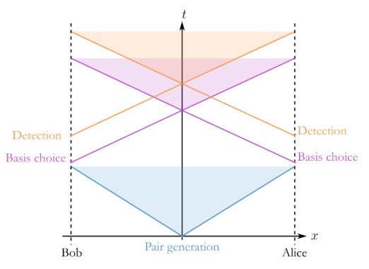 Which can be easily displayed on a space-time diagram, or Minkowski diagram, by tracing what is known as the “light cone” of an event, particularly Alice’s (or Bob’s) measurement setting choice. If the detection of Bob falls outside the light cone of Alice, and viceversa, we say these events are space-like separated.